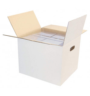 Carton de regroupement blanc avec poignées latérales prédécoupées.