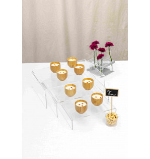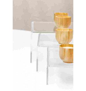 Ensemble de 3 petites tables gigogne transparentes, discrètes et utiles pour tous types de prestations événementielles ou dans une vitrine. - 200x200xh48 mm - 250x200xh60 mm - 300x200xh110 mm