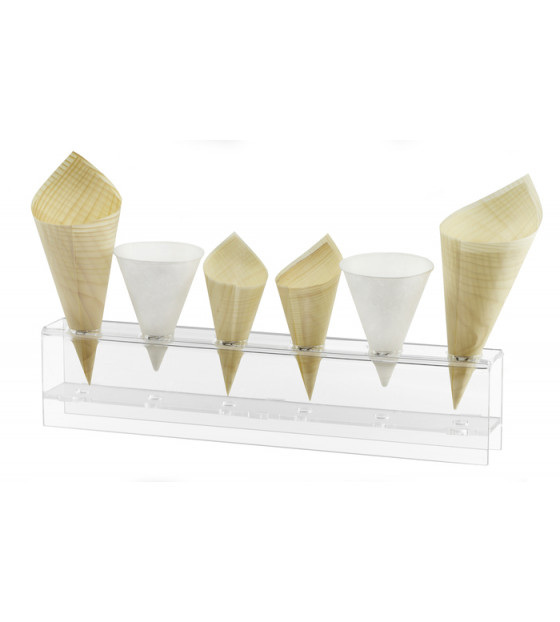 Support transparent rectangulaire pour la présentation verticale de cônes ou cornets, composé de 6 alvéoles Ø25 mm. Egalement disponible avec 9 alvéoles UNI9