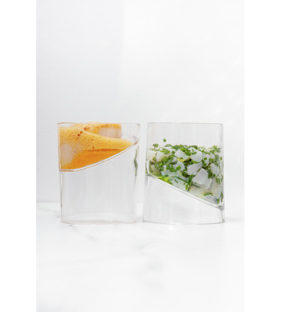 Verrine transparente légèrement évasée, réversible 8 ou 4 cl. Dans sa version 8 cl, le couvercle CBK6 permet de protéger vos créations lors d'un passage à la congélation ou pour le transport. Réutilisable. Doppio est parfaite pour jouer sur les volumes et les couleurs !