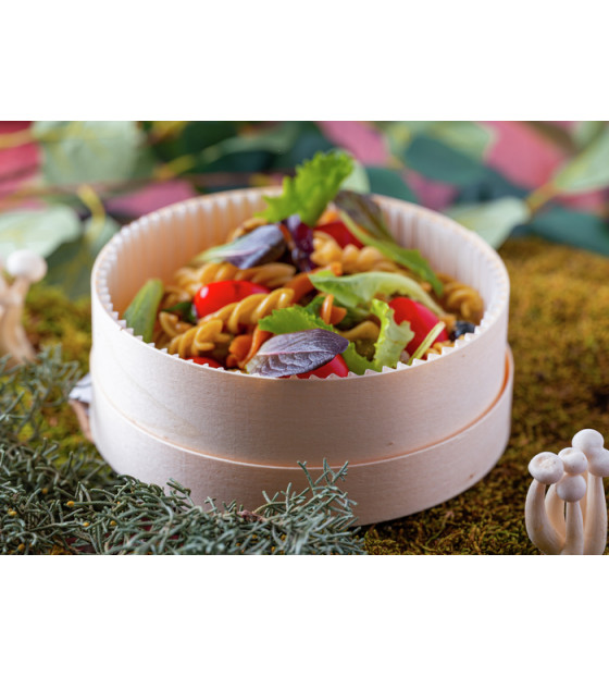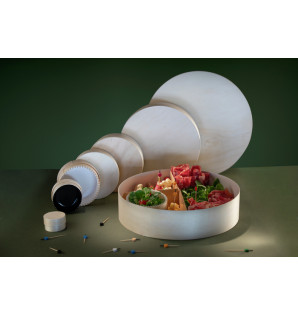 Boite ronde en bois de peuplier français, issu de forêts gérées durablement, fabriquée en France, avec une caissette blanche en papier/PET apte au contact alimentaire et étanche.
