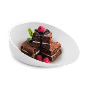 Grande assiette en bagasse blanche, au design asymétrique et épuré. Existe aussi en format coupelle KAB87S