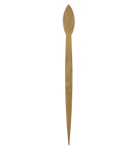 Cuillère cocktail en bambou, fine et longue. Son extrémité pointue pour être utilisée comme une pique, pour saisir facilement un fruit au fond d'un verre par exemple.