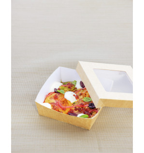 Barquette en carton recouvert d'un vernis alimentaire qui garantit son étanchéité et son ingraissabilité.