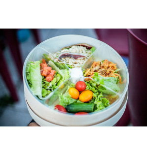 Les 4 compartiments principaux ont une capacité de 40 cl chacun, le 5ème espace central, plus petit, accueillera des sticks ou une sauce dip. La solution idéale pour des offres à partager : charcuterie, fromages, apéritifs, fruits, mini viennoseries... En rPEt, il est recyclé et recyclable.