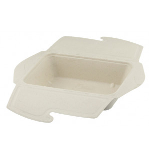 Barquette 100% végétale en bagasse avec un couvercle attenant qui se ferme par un simple appui.