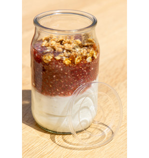 Prix 38,90 € HTConditionnement : 100VY18Pot Yogur en verre de 18 cl, pouvant être fermé de deux façons : avec un opercule aluminium thermoscellable (partie argentée vers le pot), CVA7 avec un couvercle transparent en RPET, CBK6 Apte au passage au four, au micro-ondes et à la congélation, Yogur est réutilisable et recyclable. Une excellente manière de présenter des yaourts et autres crèmes desserts. -