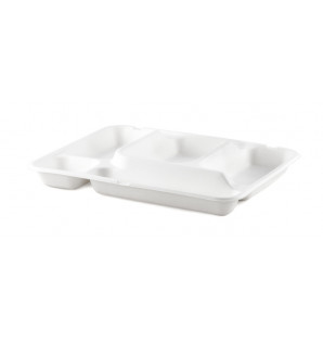 Plateau repas en bagasse avec 6 alvéoles, dont 1 alvéole latérale pour les couverts, verre ou accessoires. Il peut se compléter avec un couvercle transparent recyclable CPF6R, permettant une parfaite visibilité de son contenu. Le socle peut passer de la congélation, au four ou au micro-ondes. Plateau Snack 6 est une solution économique pour les repas à livrer (collectivités, écoles, entreprises...).