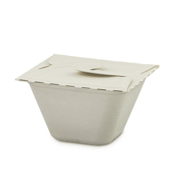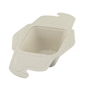 Barquette 100% végétale en bagasse avec un couvercle attenant qui se ferme par un simple appui.