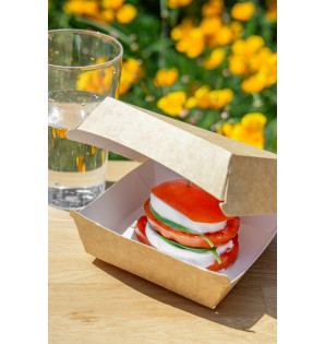 Boîte Burger en carton kraft avec un revêtement intérieur blanc.