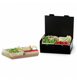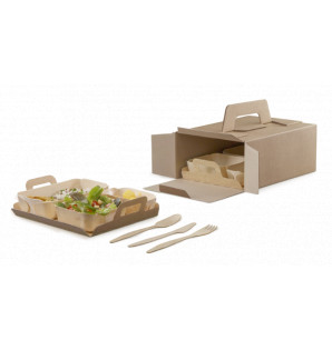 Prix 445,00 € HTConditionnement : 100YFO151 coffret Bokobox en carton kraft 270x205xh112 mm BKB27 2 plateaux de séparation en carton kraft 230x180 mm CEF 2 barquettes Madera rectangulaires 175x110 xh40 mm AMD175 2 barquettes Madera carrées 115x115xh40 mm AMD115 2 raviers Madera 120x68xh40 mm AMD120 -