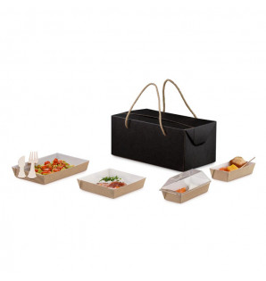 Prix 424,75 € HTConditionnement : 100YFO51 coffret Essentiel carton noir 250x185xh120 mm CEF2 2 sets de table avec anses carton kraft 230x180 mm CEF 4 bols Cubik 25 cl en carton kraft/PET 110x110xh40 mm BCN25 2 raviers Cubik en carton kraft/PET 130x65xh30 mm AKN6