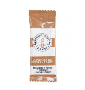 Prix 31,50 € HTConditionnement : 250DPB2Dosette de mélange de poivre 5 baies. Pratique et hygiénique sur un plateau repas ou pour la vente à emporter. Conforme aux normes et réglementations alimentaires applicables en France. Garanti sans allergènes. Une dosette de fleur de sel vient compléter ce duo disponible DFS1 . -