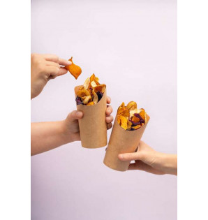 Prix 3,25 € HTConditionnement : 50PFK48Pot à wrap en carton kraft ingraissable multi-usages, de grande contenance : pour des wraps mais aussi pour des frites, churros, nuggets ou autres bâtonnets de légumes. Il est recyclable et disponible en grand conditionnement (1000 u.) XPFK48 -