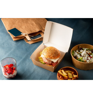 Prix 69,00 € HTConditionnement : 600BBK12Boîte Burger en carton kraft avec un revêtement intérieur blanc. Cette boîte est proposée dans notre Formule Burger à emporter 1 personne YFO1 . Fabriquée en France et recyclable. -