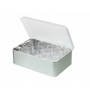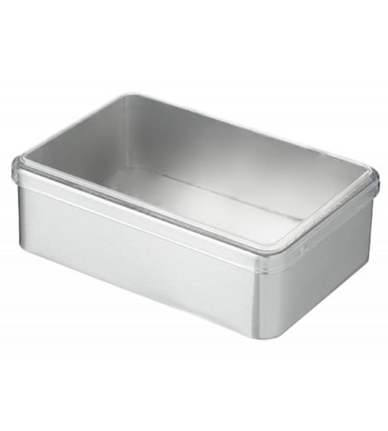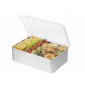 Boîte bento en métal avec un couvercle à charnières en PS transparent. Son format style boîte à sucre est très pratique et original pour la vente à emporter de mini sandwichs, biscuits ou même des mini verrines. Fabriqué en France, il est réutilisable et recyclable.