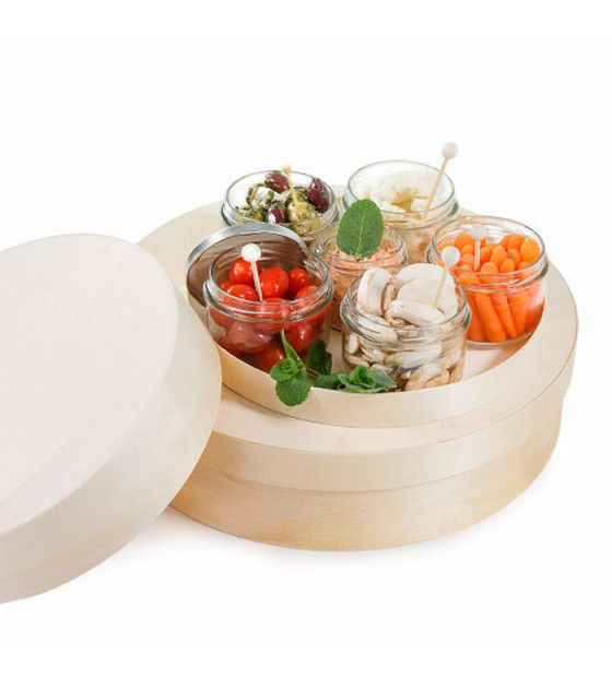 Grande boite en bois ronde avec x5 Bokotwist 26 cl et x1 Bokotwist 13 cl. Idéal pour partager apéritifs ou petits déjeuners. Réemployable.