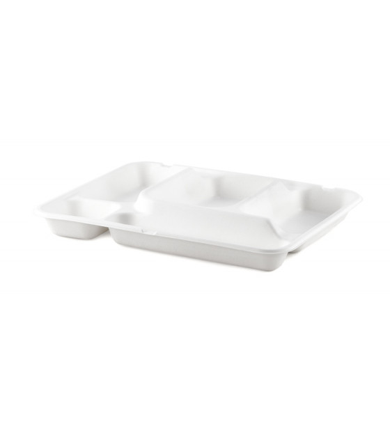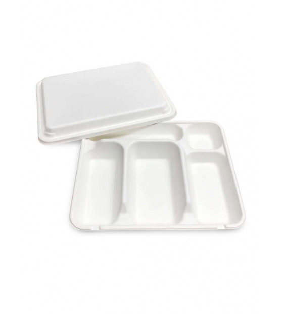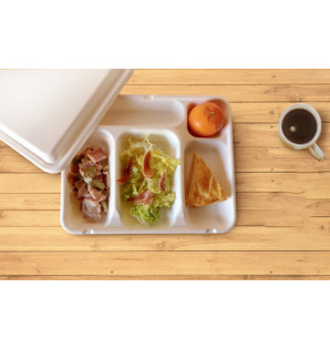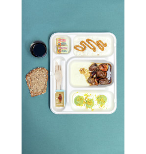 Petit plateau repas en bagasse avec 5 alvéoles, dont 1 pour les couverts. Il peut se compléter avec un couvercle assorti CPF5F. L'ensemble peut passer de la congélation, au four ou au micro-ondes. Plateau Snack 5 est une solution économique pour les repas à livrer (collectivités, écoles, entreprises...).