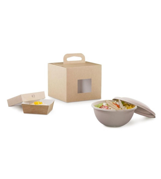 Formule Bento avec 1 bol avec couvercle bagasse 100 cl et 1 barquette kraft 40 cl. Idéal pour un menu 1 personne.