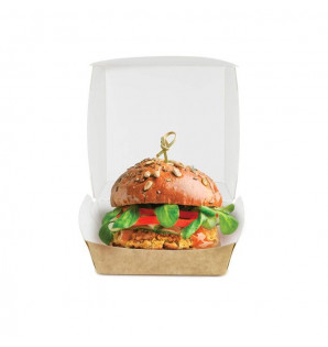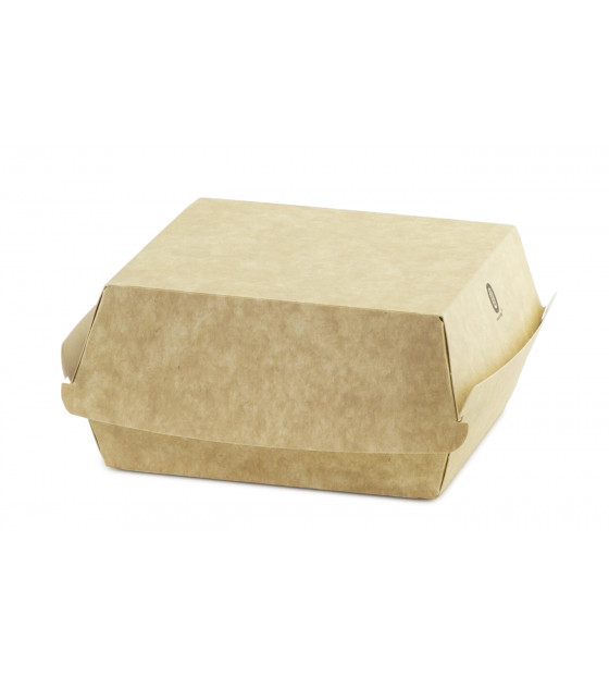Large boîte Burger en carton kraft avec un revêtement intérieur blanc.