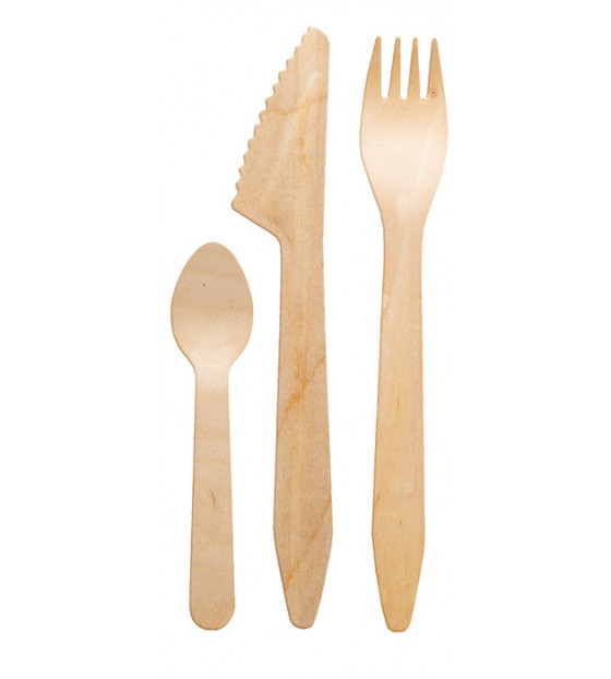 Couverts Madera en bois en kit /1 présenté dans une pochette kraft avec : fourchette, couteau, petite cuillère, serviette, sel et poivre.