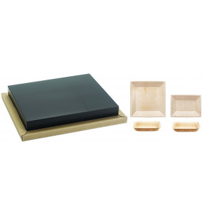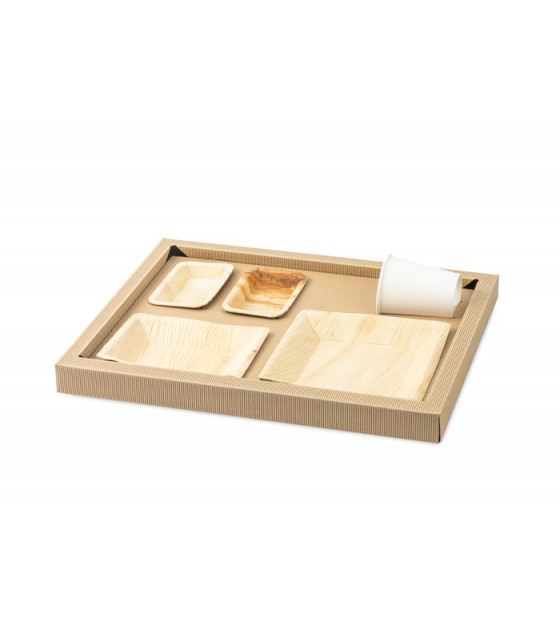 Plateau-repas prêt à l'emploi et livré monté, composé de : - Socle + cale en carton kraft micro cannelures, recyclables - Couvercle en carton noir, recyclable - 1 assiette 180x180mm, 1 assiette 170x120mm et 2 assiettes 120x70mm. La vaisselle en palmier est apte à la cuisson au four et au micro-ondes. Le plateau est également disponible avec un couvercle cloisonné transparent BK4A