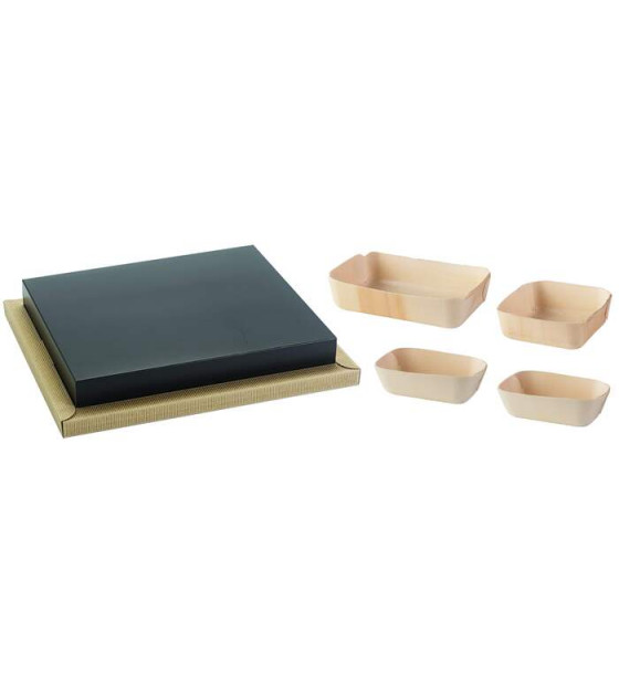 Plateau-repas prêt à l'emploi et livré monté, composé de : - Socle + cale en carton kraft micro cannelures, recyclables - Couvercle en carton noir, recyclable - 1 assiette 175x110mm + 1 assiette 115x115mm + 2 assiettes 120x70mm. La vaisselle en bois de peuplier et film PET est étanche, apte à la cuisson au four et au micro-ondes. Le plateau est également disponible avec un couvercle cloisonné transparent BK5A