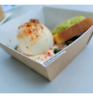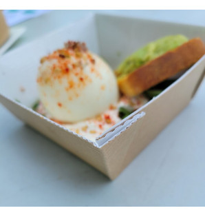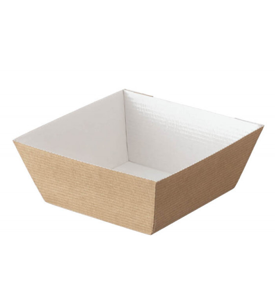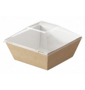 Bol en carton kraft de 55 cl avec un revêtement en PET qui le rend étanche (y compris aux angles). Adapté à un passage au four (100°C) et au micro-ondes.
