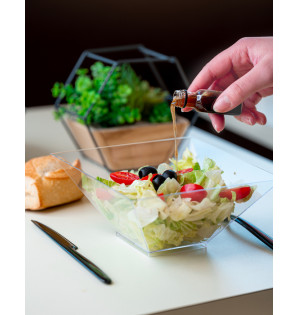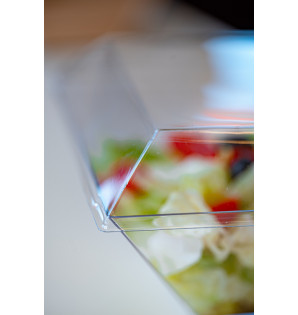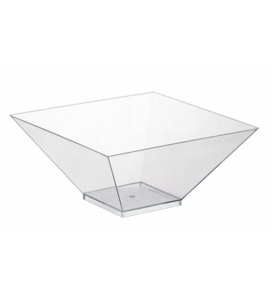Bol saladier carré avec une large ouverture. En PS transparent, il est recyclable.