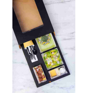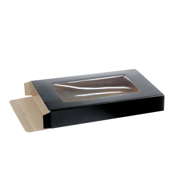 Étui en carton noir avec une fenêtre en PVC (310x170 mm) pour une parfaite visibilité du contenu. Les plateaux glissés à l'intérieur seront transportés en toute sécurité et de manière hygiénique. Cet étui est adapté au socle plateau-repas SBN4N.