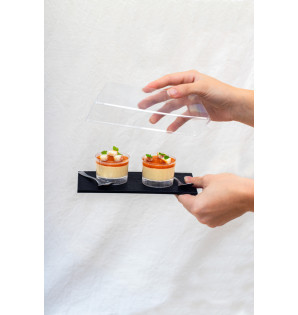 Prix 45,00 € HT Prix de base 55,65 € HTConditionnement : 100AT189Mini plateau noir sans rebord, à la texture effet ardoise.Très qualitatif, il est lavable, réemployable et recyclable. Un couvercle transparent d'une hauteur de 4.5 cm est disponible CT189 -