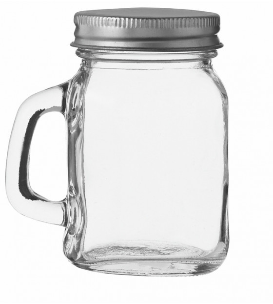 Mini mug en verre de 12 cl avec bouchon en métal gris à visser. Idéal pour des présentations à servir ou à emporter, avec une note ludique. Apte à la congélation, il est recyclable. Disponible en petit conditionnement de 20 u. MMP12