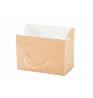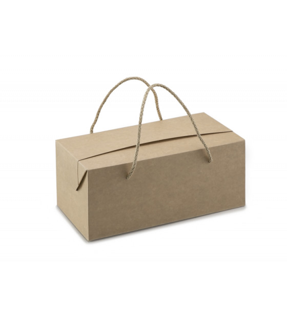 Coffret repas en carton kraft, avec deux cordelettes naturelles en guise d'anses. Son ouverture par le haut facilite le remplissage et donne une bonne visibilité de son contenu. Livré à plat, il se monte facilement grâce à son fond automatique, les cordelettes sont à insérer à la fin. Faubourg existe également en noir FBG28