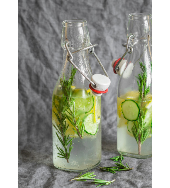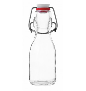 Mini bouteille à limonade en verre de 12 cl, avec son bouchon traditionnel attenant blanc et son joint en caoutchouc orange. Facile à emporter et esthétique sur une table de réception, elle vous permettra de présenter des boissons de façon ludique, en proposant une paille en accessoire. Réutilisable et recyclable.