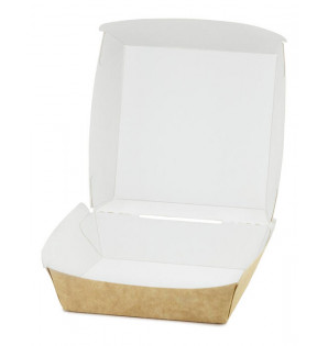 Boîte Burger en carton kraft avec un revêtement intérieur blanc.
