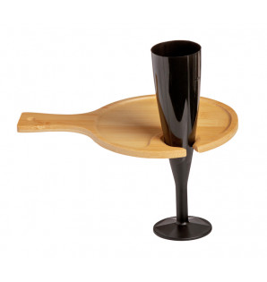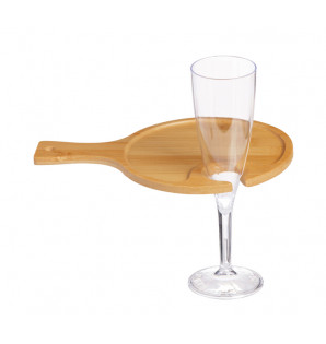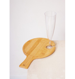 Assiette cocktail porte-verre ronde, en bambou de qualité premium. Son encoche (100 mm, Ø30 mm) permet de placer un verre à pied ou une flûte (FLC15, FC13PPN). La surface restante sera utilisée pour placer quelques bouchées ou piques apéritives. Facile à porter grâce à son manche de 70 mm, elle est parfaite pour des soirées événementielles, des réceptions ou des apéritifs dinatoires Lavable et réemployable.