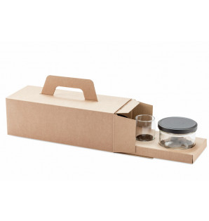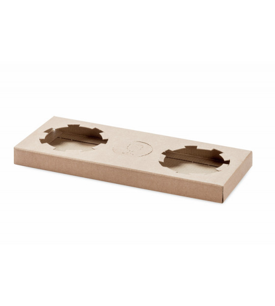 Cale polyvalente idéale pour emporter ou livrer un repas individuel, avec le coffret BKB33. Elle permet de placer 2 contenants + 1 verre : - 2 perforations Ø82 à Ø97 mm (BKW45 ou BKW26 ) - 1 pré-perforation Ø55 mm pour 1 verre (gobelet de 10 cl ou Comptoir XGV016 ). La cale est recyclable et fabriquée en Europe.