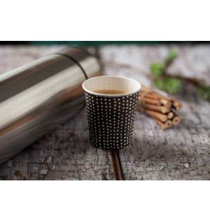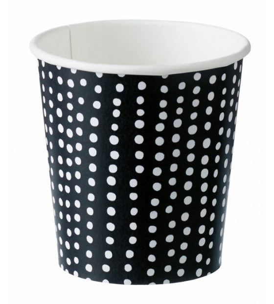 Gobelet en carton/PE de 10 cl, extérieur noir et pois blancs. Un couvercle en bagasse est disponible pour maintenir la boisson chaude plus longtemps et pour faciliter le transport CV63F. Aroma to Go existe en 20 cl XGCA20