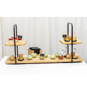 Gamme de planches de présentation en bambou massif disponible en 20x20 cm PBK200, 40x20 cm PBK400 et 80x20 cm PBK800. Avec une épaisseur de 2 cm, les planches sont très qualitatives et réemployables. Pour des présentations de buffets élégants et pour jouer sur les hauteurs, vous pouvez les disposer sur les rehausses en bois RGA3 ou bien sur un de nos supports métal antidérappants Obvie SMN405. Lavage avec un chiffon doux conseillé.