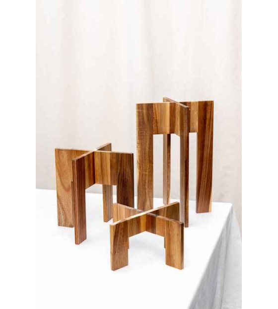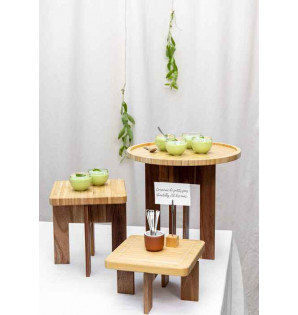 Trois supports gigogne en acacia pour présenter des planches ou des plateaux (en photo avec la planche Karou PBK200). Les 3 hauteurs de 10, 20 et 30 cm donneront du relief à vos réceptions. Simple à faire et à défaire, les éléments s'imbriquent les uns dans les autres et le stockage est à plat !