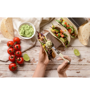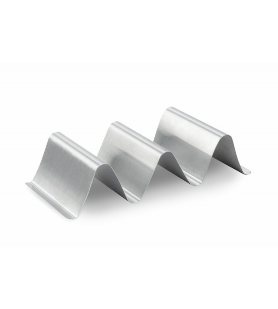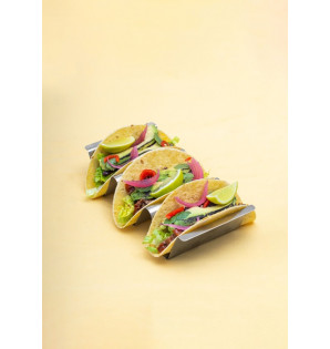 Support en acier inoxydable pour 2 ou 3 tacos. Accessoire indispensable à la préparation de cette spécialité mexicaine, il est robuste, lavable et réutilisable. Il permet de remplir proprement chaque tacos.