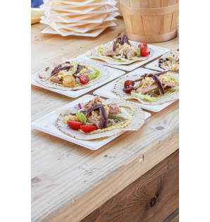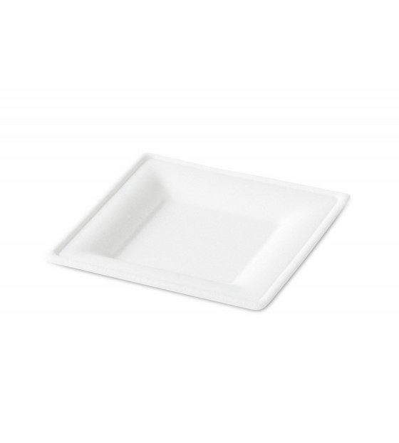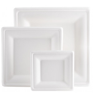 La gamme d'assiettes Fibra en bagasse blanche est composée de 3 assiettes carrées et d'1 assiette rectangulaire. - AF160 : 160 x 160 mm (surface utile 80x80) - AF200 : 200 x 200 mm (surface utilse 120x120) - AF260 : 260 x 260 mm (surface utile 155x155) - AF2820 : 280 x 200 mm (surface utile 220x140) Chacune peut également servir de mini plateaux de présentation, leur bord surélevé permettant une parfaite prise en main.