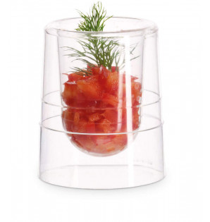 Verrine double paroi pour réaliser des présentations suspendues originales ou pour un café. La transparence et la cavité surélevée donnent un effet de lévitation ! Base large Ø59 mm. Dimensions utiles : Ø40 x h60 mm.