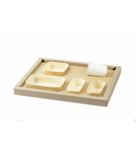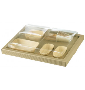 Plateau-repas prêt à l'emploi et livré monté, composé de : - Socle + cale en carton kraft micro cannelures, recyclables - Couvercle cloisonné en rPET transparent, recyclé et recyclable - 1 assiette 175x110mm + 1 assiette 115x115mm + 2 assiettes 120x70mm. La vaisselle en bois de peuplier et film PET est étanche, apte à la cuisson au four et au micro-ondes. Le plateau est également disponible avec un couvercle noir en carton BK5AN