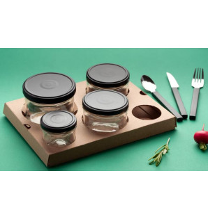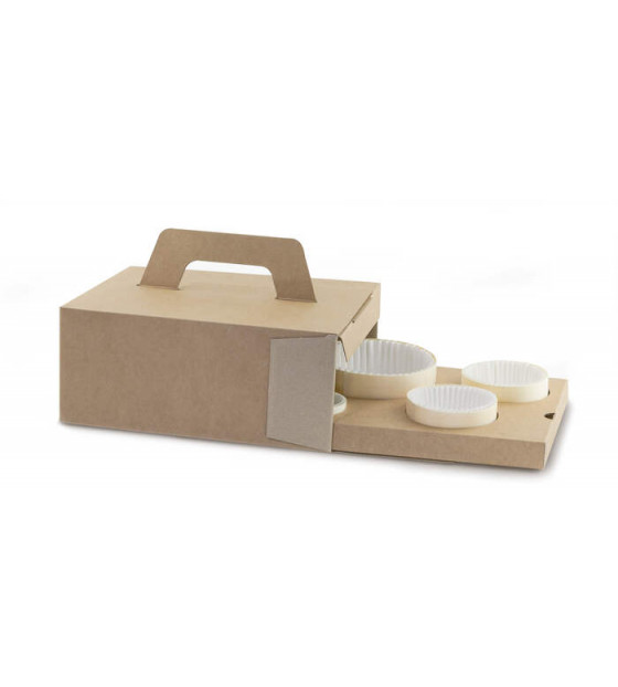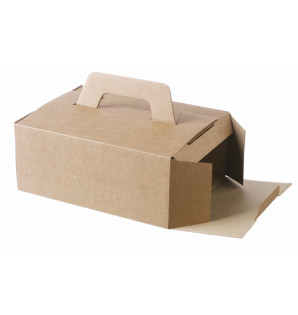 Coffret repas en carton kraft, avec poignée rabattable.