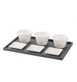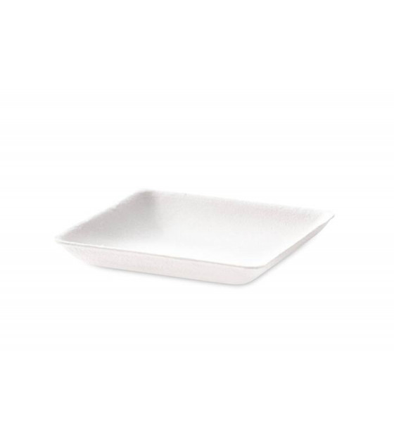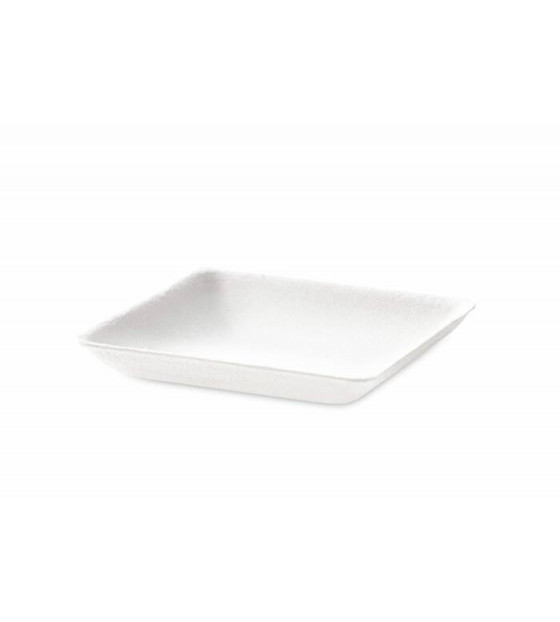 Mini plat carré en bagasse blanche, pour la présentation d'amuse-bouches gourmandes. Son design épuré est parfait pour les buffets naturels.