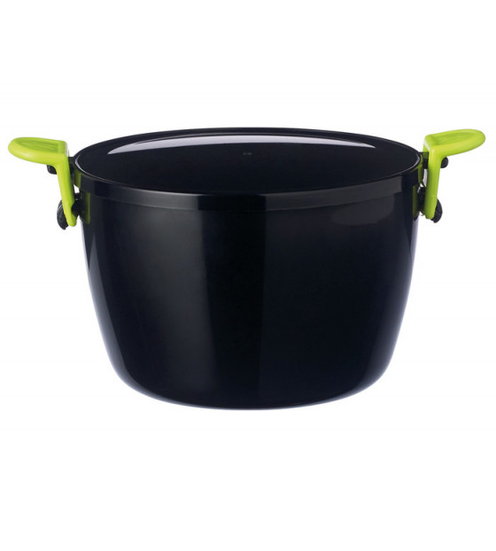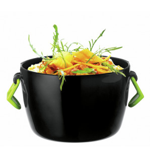 Contenant noir style bocal traditionnel, avec deux clips verts pour fixer son couvercle. En PP, il est micro-ondable, réutilisable et recyclable. Modèle disponible en version PS transparent 25 cl BOK25C