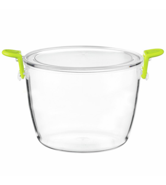 Contenant transparent style bocal traditionnel, avec deux clips verts pour fixer son couvercle. Réutilisable et recyclable. Modèle disponible en version PP noir 17cl BOK17N