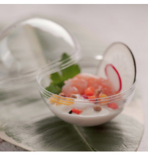 En PS transparent, il mettra en valeur son contenu (salade, patisserie...).