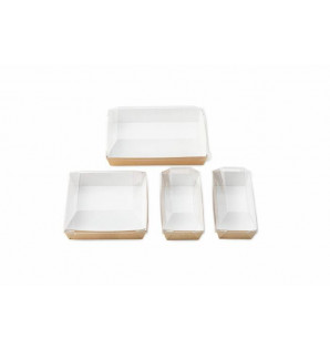 Prix 26,85 € HTConditionnement : 100CK270Couvercle transparent en rPET (recyclé et recyclable) d'une hauteur de 4 cm, adapté l'assiette bagasse rectangulaire de la gamme Komodo AK270 -